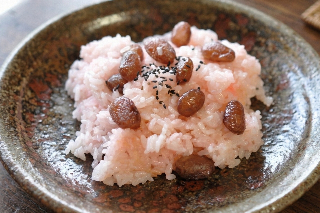 祝い事や節目の日の定番。晴れの日を象徴する特別な食べ物として、菓子屋や餅屋が仕立てて配る文化も根づいてきました。一般的な小豆の代わりに甘納豆(砂糖がけにした金時豆)を使うのが北海道流で、食紅でほんのりピンク色に色付けするのも特徴です。