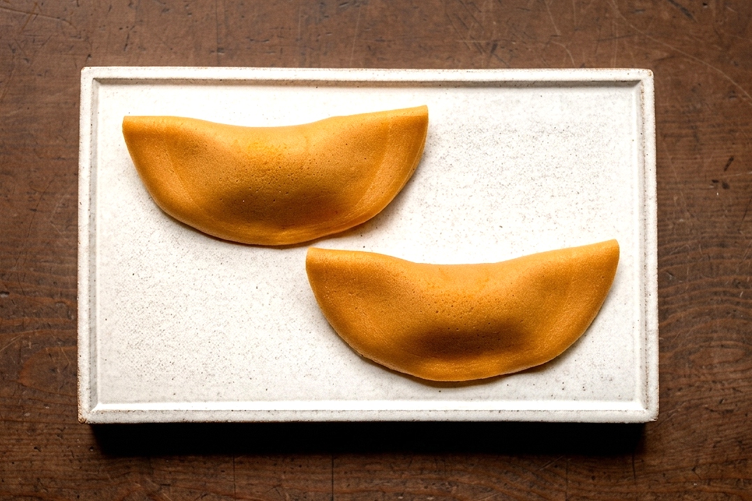どら焼き風の生地で半月形にあんを包んだ和菓子。お供えや香典返しとして親しまれてきました。