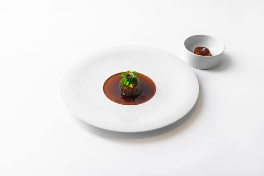 函館で訪れた狩猟地のひとつで獲れたエゾシカを使用。生産者が丁寧に命と向き合う姿に触れたブルノは、その想いを料理に映し出したいと考えました。選んだのは、最もやわらかなフィレの部位。低温で2時間かけてじっくり火を入れたのち、備長炭で香ばしく焼き上げることで、繊細な燻香としっとりとした食感を引き出しています。熟成モデナ産バルサミコとフレッシュなマイクログリーンを合わせたソースは、肉の旨みを引き立てながら全体のバランスを整えます。付け合わせには、七飯産男爵いものやわらかなニョッコに、12時間煮込んだエゾシカと野菜のラグーを詰め、深みのある味わいに仕上げました。