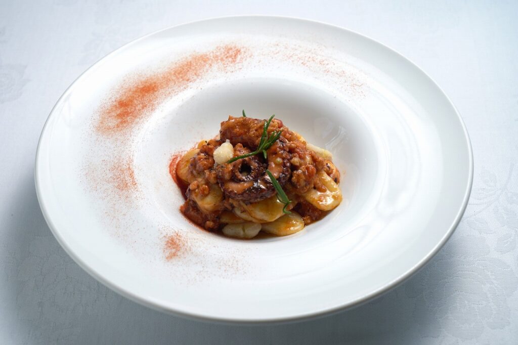 「マルヒラ川村水産」のマダコをトマトで柔らかく煮て、ミンチ、スライス、ブツ切りと3種類の食感が味わえるラグーに仕上げています。パスタは南イタリア伝統の、セモリナ粉と水だけで作った「ストラシナーティ」(引きちぎるという意味)。もちもちとした食感と弾力ある歯応えが柔らかいマダコと白インゲン豆によく合います。