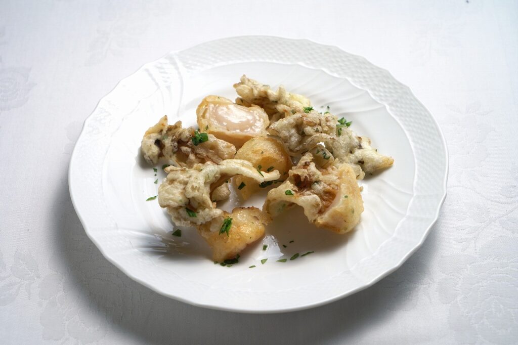 函館の海の幸と山の幸のフリット。とても香りの良い「蝦夷舞茸」を2日間セミドライにすることで、香りをさらに凝縮します。「マルヒラ川村水産」のホタテはとても甘く昆布を思わせる旨みと香りが強いので、天ぷらの手法と同じく、蒸し上げるようにし、中はレアな状態で提供します。