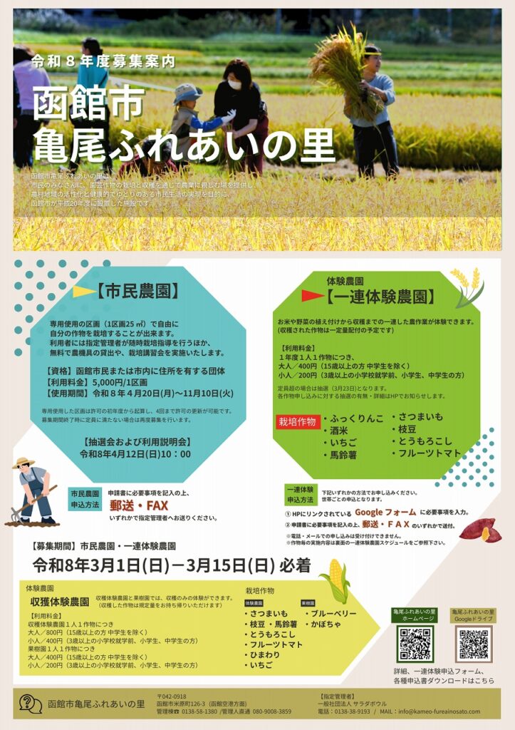 函館市の指定管理施設「函館市亀尾ふれあいの里」にて、令和8年度の施設利用者を募集しています(申込3月15日必着)。